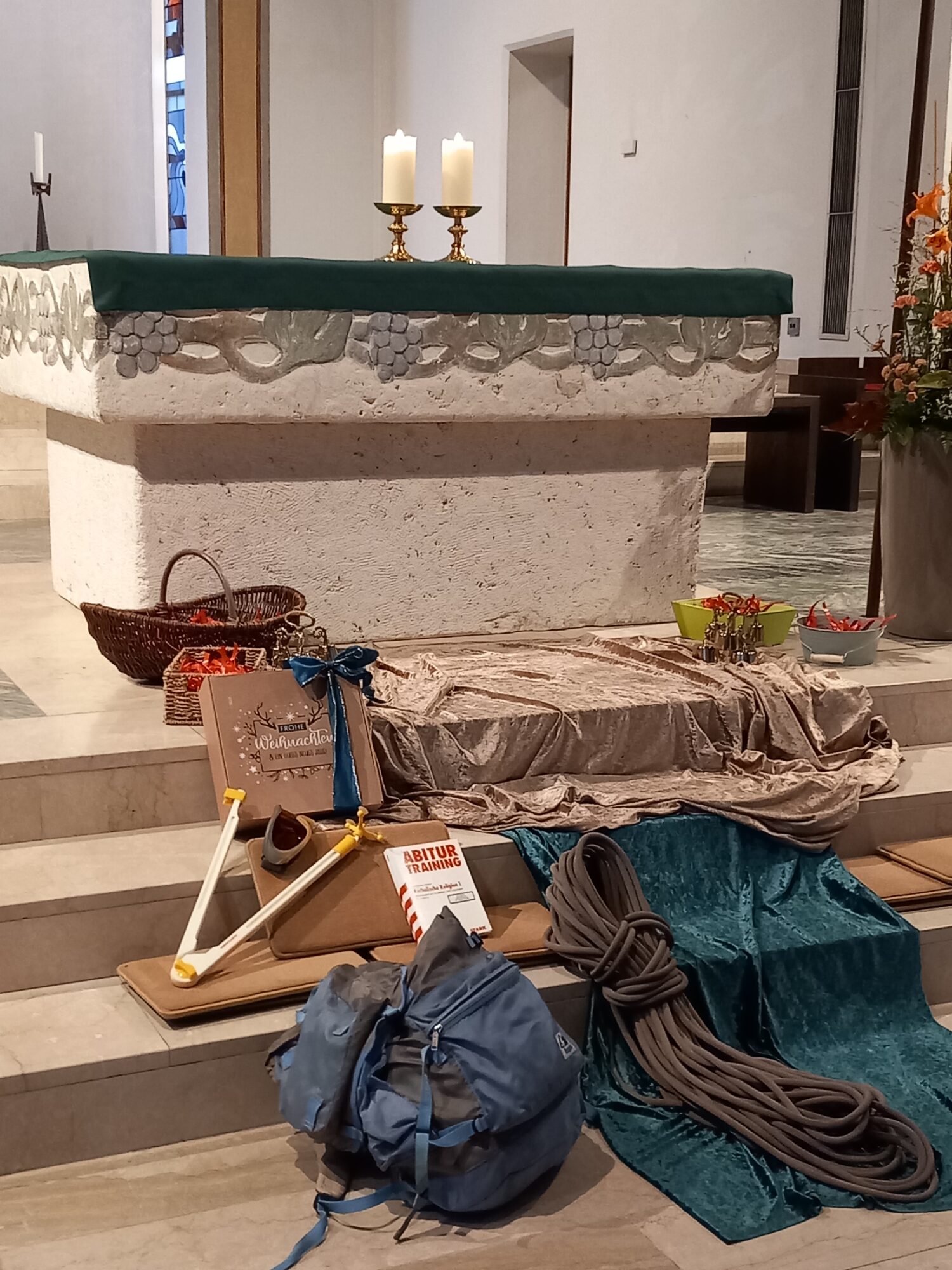 Natürlich muss man für eine Bergtour gut gerüstet sein. Aber was beim Anspiel alles mitgeschleppt wurde – ohje! Skibrille, Abitrainer, Zirkel, Weihnachtspäckchen und riesige Rucksäcke! Schnell wurde klar, dass im übertragenen Sinn man sich überlegen sollte, was man wirklich braucht, wenn man einen langen „Schul-“Weg mit Prüfungen und Lernetappen, mit Referaten und Ausflügen vor sich hat. Gekonnt aufgegriffen hat dies Religionslehrer S. Reißl in seiner (hier gekürzt wiedergegebenen) Predigt zu Mt 6,19-34 Von der rechten Sorge – natürlich aus der BERGpredigt!
