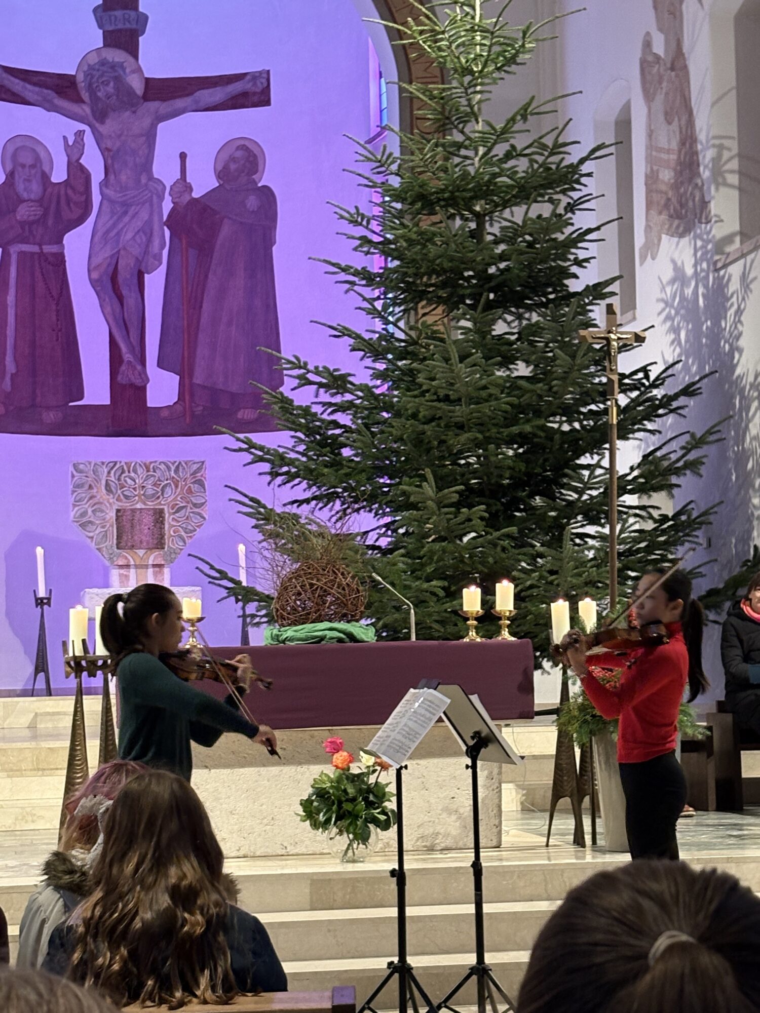 Wunderbare weihnachtliche Weisen vorgetragen vom Schulchor unter Leitung von Frau Weißenborn, dem Bläserensemble von Herrn Lugosi sowie vom Lehrerchor erfreuten die Herzen ebenso wie das Violin-Duett der beiden Schwester Alessia und Elena Conrad. Die Andacht selbst, die sich thematisch in das AVG-Jahresmotto „Bergtour“ einreihte, wurde sehr gefühlvoll von den beiden Fachschaften Religion und unter Mitwirkung zahlreicher Schülerinnen und Schüler gestaltet. – So kann Weihnachten kommen! Einen herzlichen Dank an alle Mitwirkenden!